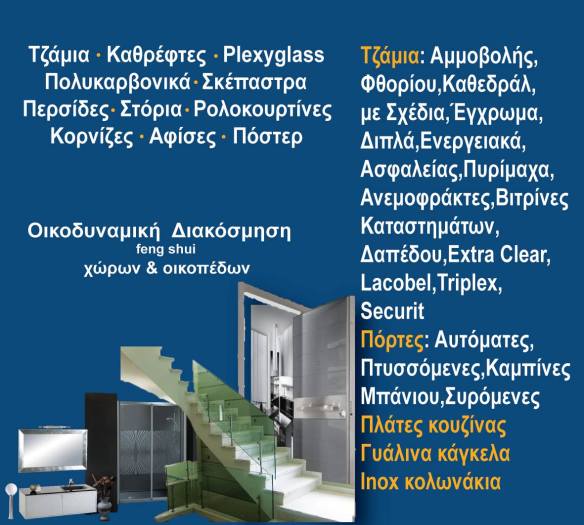 Η Υ α λ ο τ ε χ ν ι κ ή Παπαϊωάννου προτείνει ιδανικές διακοσμητικές και κατασκευαστικές λύσεις σε όλο το φάσμα των εφαρμογών του Γυαλιού, των Καθρεπτών, των Συστημάτων Σκίασης, της Κορνίζας, των αφισών-πόστερ και της Διακόσμησης «Αρμονία Χώρου»-Οικοδυναμικής, καλύπτοντας και τις πιο εξειδικευμένες απαιτήσεις.