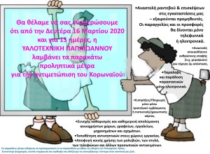 Μετά και την απόφαση του Παγκόσμιου Οργανισμού Υγείας (ΠΟΥ) να χαρακτηρίσει την εξάπλωση του Κορωνοϊού ως Πανδημία, η ΥΑΛΟΤΕΧΝΙΚΗ ΠΑΠΑΪΩΑΝΝΟΥ με αίσθημα ευθύνης απέναντι σε όλους εσάς, στους υπαλλήλους και στις οικογένειες τους, αλλά και απέναντι στους πολίτες και ειδικά αυτούς που ανήκουν στις ομάδες υψηλού κινδύνου, θεωρεί υποχρέωσή της να λάβει επιπλέον τα παρακάτω μέτρα.