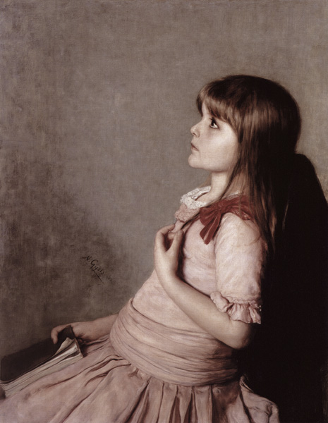 Ο Γύζης, σε ένα σαγηνευτικό πίνακά του, την Αποστήθιση 1883, (ιδ. Συλλ.) μία αστική ηθογραφία, απεικονίζει ένα καλοντυμένο μικρό κορίτσι που καθισμένο, με το βιβλίο στα γόνατα και ανασηκωμένο ελαφρά το κεφάλι, αποστηθίζει το μάθημά του. Το σφιγμένο στόμα, τα στυλωμένα λαμπερά μάτια «μιλούν» πολύ εύγλωτα και πειστικά για την προσπάθεια του παιδιού και την κρυφή ένταση που το κατέχει.