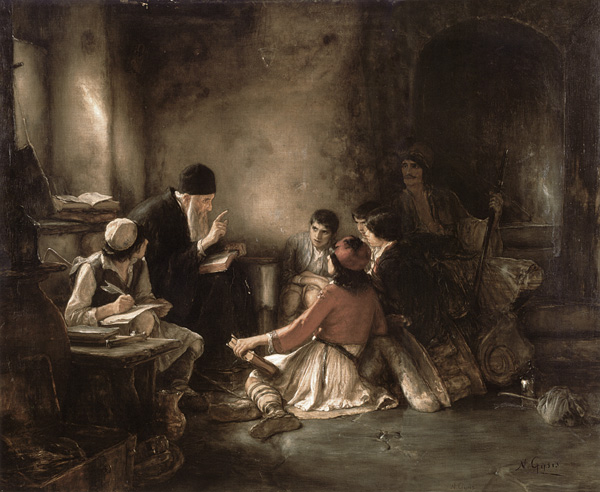 Ο ίδιος ο καλλιτέχνης γράφει χαρακτηριστικά για το έργο, σε ένα γράμμα τους στον πεθερό του, το 1886: «Εις γωνίαν εντός σκοτεινού υπογείου εκκλησίας, μπαρωμένης της θύρας, καθήμενος γέρων καλόγηρος, επί των γονάτων αυτού έχων βιβλίον και περί αυτόν πέντε παιδία εφήβου ηλικίας διδάσκει αυτά. Δια του υπογείου, της κλειστής θύρας και παραθύρου και δια του οπλησμένου νέου, εσκέφθην να παραστήσω την εποχήν εκείνην της Ελλάδος ότε επί Τουρκοκρατίας ήσαν αυστηρώς απηγορευμένα τα σχολεία και μόνον εν κρυπτώ εξετελούντο. Η εικών αύτη είναι μικρά, με δυσκολεύει η αρμονία της καθότι ηθέλησα να παραστήσω μυστηριώδη πράξιν εις σκοτεινόν υπόγειον μόνον δια μιας ακτίνος ηλίου εισερχομένης εντός και δια της αντανακλάσεως αυτής της φωτοσκίασιν των προσώπων και λοιπών αντικειμένων».
